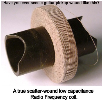 Make no mistake, no guitar pickup is scatter wound because the bobbin is not round (as it must be) and the plastic coated winding wire used in pickups is not suitable. True Scatter winding is a highly organized form of coil winding with cotton covered wire originally designed for Radio Frequency coils used in vintage Vacuum Tube Radio’s. See picture below. It was developed in the early 1900’s to minimize capacitance in the Pico farad region which adversely affect Radio frequencies in the 50+ KHz band. The impact on audio frequencies, even at 20KHz, is non existent or is so tiny as to be inaudible. Anyone who believes so called scatter wound pickups are superior to expertly machine wound is deluded.