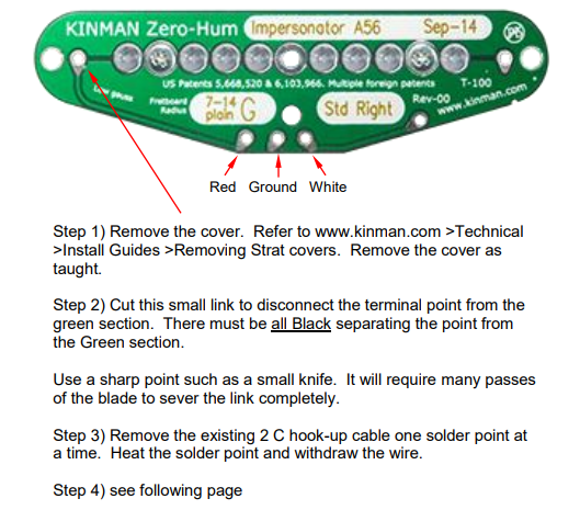CAUTION: Embedded solder points on the baseplates of Kinman pickups can be damaged