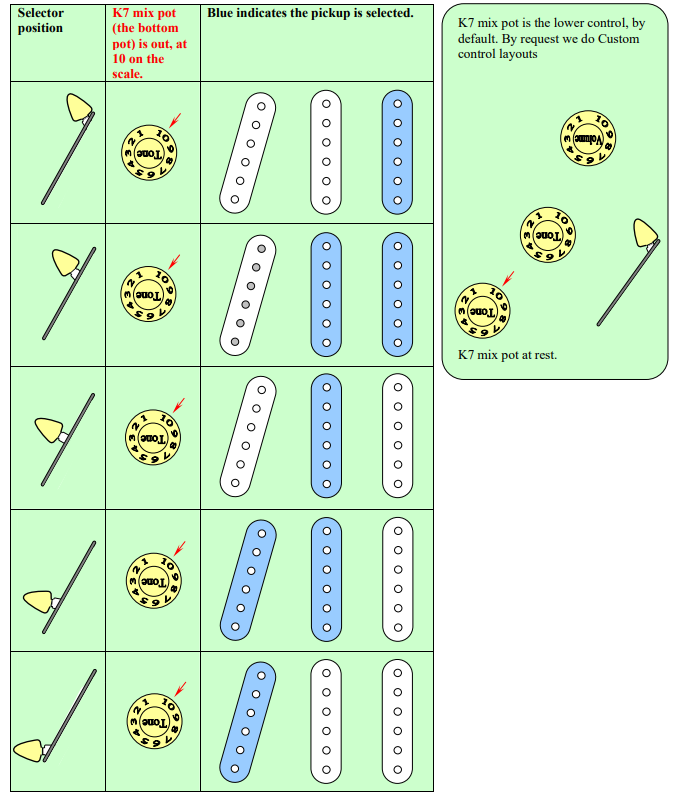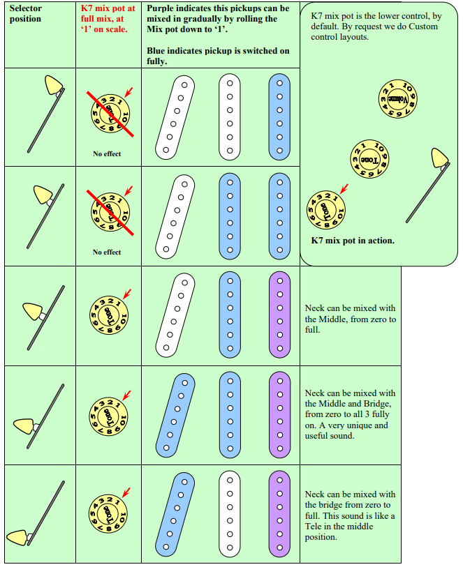 This table displays the pickup selection with the K7 mix pot operating the neck pickup at maximum mix. Note the extremely useful combinations of Neck + Bridge (for a Tele mid position sound) & all 3 pickups together (something new). Gradual mixing of pickups is also useful, displayed in Purple.