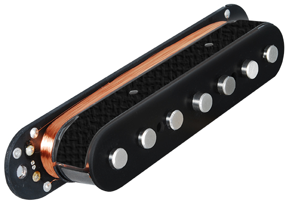 The bigger the string the greater is the magnet pull that is exerted on it. The B-7th is very big but our special Alnico-K5 rod magnets have just 60% of the magnetic strength of regular Alnico-5 so string pull is minimized, as is string crash and string warble (Strat-itis) while sustain is maximized. The sound has great clarity, not just because it's free of the clutter of 60Hz mains hum and fret rattle & buzzing notes but mainly due to our unique coil design (designed especially for the low B it's not just an ordinary coil). Also our magnet stagger is optimized for the usual 16" fretboard radius (+ or - 2") on 7 string guitars and designed to provide exceptional string level balance across all strings, including the plain G-3rd.