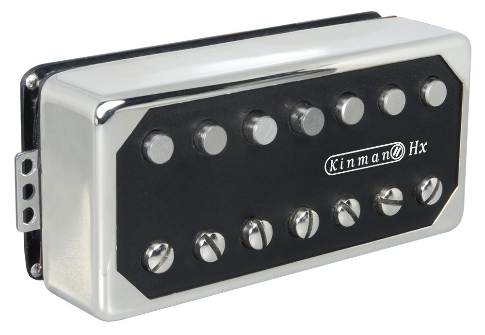 and here is our 'Trebuchet' 7 String version of our fantastic 'P90-Bucker' Custom made for a customer. Our new Custom Shop is now offering a variety of Absolute Zero-Hum 7 String pickups. We can make 7 string versions of our fabulous Twang-Bucker and P90-Bucker which produce 110% single coil sound, as well as more conventional humbucker models such as 59+ LPS, P.A.F Plus, Big Little Terror and Big Little Ripper including a fully noiseless split single coil Converge-3. And if coil splitting is your thing there is our ESSC (Enhanced Split Single Coil) All in a hand buffed Nickel-Silver or Durable Black extended humbucker cover. Kinman applied our advanced Patented technology and our 7 string models are lively, bouncy, dynamically responsive with great attack and no mush or mud on the low wounds. Generally the sounds is clear and open and airy. We can also make a variety of 7 String pickups in Soapbar P-90 Hx as well as Strat pickups.