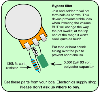 By the way, this design works better than a 'capacitor' only -or- the parallel 'resistor/capacitor' design that some makers fit to their guitars, so if you didn't like theirs try this one. These circuits, including mine, are quite crude and won't suit all conditions. They leave very little latitude in deviating from the nominated cap value. You will have to experiment to arrive at the perfect value for your cable. To save time in experimenting you can run some wires out from the volume pot under the edge of the pickguard then you can connect various value caps and resistors to the ends of those wires in a matter of seconds. When you get the right combination they can be soldered to the pot terminals.