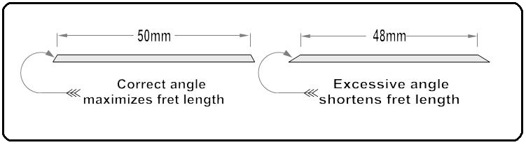 One thing that can impact on choice of bridges is the way the ends of the frets have been finished. Fret ends that have been filed with excessive angles means the strings coming off a wider vintage bridge will be perilously close the end of the working surface and become prone to falling off onto the ramp surface. This is especially true for high frets such as Jumbo or Gibson sized fret material. The illustration below clearly shows the reason it's important to pay attention to this aspect of refretting.