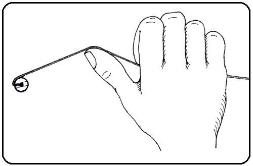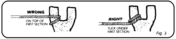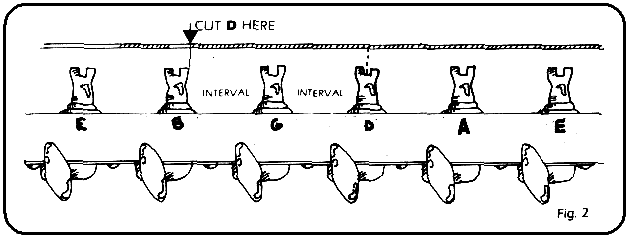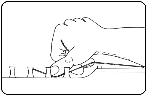 Next is the way the strings are terminated around the tuner shafts. Basically you need to keep the turns around the shafts to a minimum. In 1984 I developed a way of limiting this to half a turn and with no slippage, provided you have the split shaft tuners such as Klusons or Gotoh (my favorites because the split in the shaft allows you to lock the string on with an absolute minimum of turns). Many players believe that wrapping all of the excess string around the tuner shafts will prevent slippage but actually the reverse is true. All those overlapping turns provide a lot of scope for slippage and sudden re-seating. Same goes for tying strings onto the tuner shaft. First step, cut the E & A strings 25mm (1") past the corresponding shaft and poke the end into the hole at the bottom of the split. Then, after bending the string sharply out of the slot and with the string pulled tight with your fingers (see diag 3 and 4 below), wind the string around the shaft and up to pitch. Second step, cut the D, G, B & E strings cut 40mm (1 -5/8") past the respective shafts (shown in diagram 1 below). Poke the end into the hole and wind tightly around the shaft for 1/2 turn, then lead it back through the slot again (for a second time) and continue winding up to pitch. Take care to ensure that on the second pass through the slot that the string exits the slot underneath the first loop of string, not on top of it (see diag 2 below). This helps to maintain more break angle over the nut by providing a steeper exit angle behind the nut.