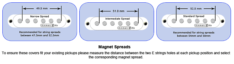 For your information Kinman Strat pickups are available with a choice of 3 different magnet spreads that provides optimum alignment of the magnets to the strings. Doing this ensures the best balance of string volumes without drop-off, especially during stretching the strings sisdeways accross the fretboard. All other brands have just one magnet spread and we think that is inadequate and quite un-satisfactory since at least one of the E strings over the neck pickup will often align outside the outer edge of respective magnets and consequently will not be as loud as the other strings. Eg American Standards have this problem.