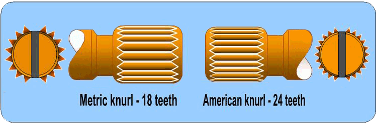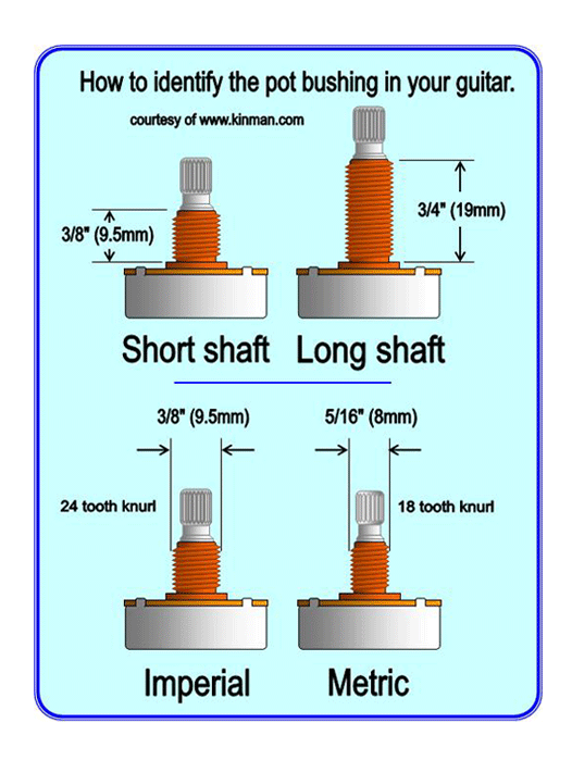 Shafts: Pots used in most guitar have a serrated shaft called a Knurl that grips the inside of 'push on' knobs. American pots have a fine 24 tooth Knurl while metric pots (Japanese etc) use a coarse 18 tooth Knurl with a slight smaller diameter, as shown in this photo.