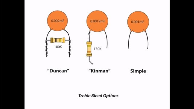 I get asked a lot about how to stop losing treble/presence when the volume is turned down. Kinman Hx pickups don't suffer from this phenomena to the same degree as regular single coils, in fact many Kinman owners tell me they noticed the problem disappear when they fitted their Kinman's. This device, when used with Kinman Zero-Hum pickups, might actually increase the brightness slightly as the volume pot is wound down, making it great for volume reduced rhythm chops. When used with regular non-noiseless single coils it attempts to preserve the amount of brightness as the volume pot is wound down. But if you have this problem and want to reduce it I devised a little circuit that helps. It is simply a .0012uF (1.2nF) 63* volt Polyester capacitor in series with a 130K Ohm resistor (1/4 or 1/2 watt) that is wired across the two hot terminals of the volume pot (*the voltage rating does not impact the performance of this device, any voltage cap will work fine but 63 to 100 volt caps have lead wires that are easy to work with). A rudimentary way of looking at it is the cap allows some of the high frequencies to pass around the volume pot direct to the output and the resistor limits the amount of them that get past. The capacitance can be varied slightly from .001 to .0016 to fine tune the circuit to your cable, but you will have to increase the resistor value with the larger cap values and decrease the resistor value with the smaller cap values or else you will notice the curve of the pot starts to become noticeably different with the larger cap values. It's a delicate balance so deviating from the nominated values may excessively flatten the operating curve of the pot unless you compensate with the resistor value. Read more technical guff about this on the FAQ page Q24 . Rule of thumb is the *amount* of brightness that is gained is determined by the resistor's value (less Ohms = more brights) but the frequencies that are present is determined by the Cap value (lower the value the higher the frequencies, the higher the value the lower the frequencies).